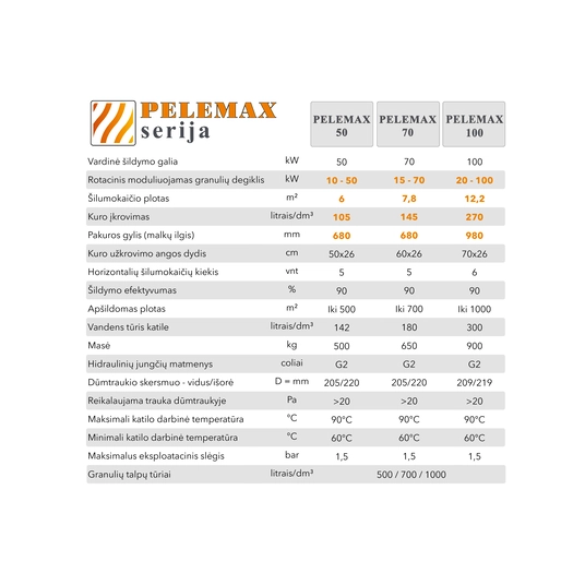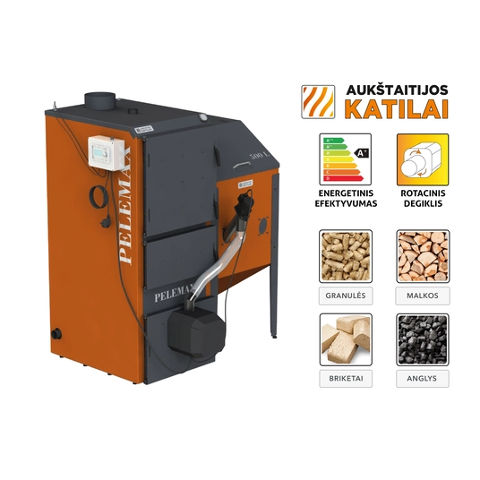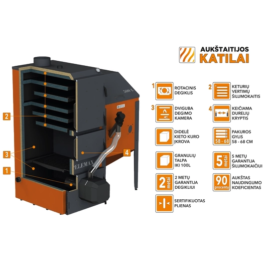 Granulinio katilo ypatumai: • universalus granulinis katilas su rotaciniais degikliais, kurie gali kūrenti prastesnės kokybės kurą; • su penkiais šilumokaičiais, dūmas verčiamas keturis kartus, todėl didesnė dalis šilumos pasilieka katilo viduje, o vėliau yra išspinduliuojama aplinkai; • degiklis moduliuojamas ribose: 6-36kW; • tinkamas kuras - medienos granulės, malkos, briketai, anglys; • malkų ilgis - iki 68 cm; • kuro talpos tūris - 1000 litrų; • šilumokaičio plotas - 6 m².