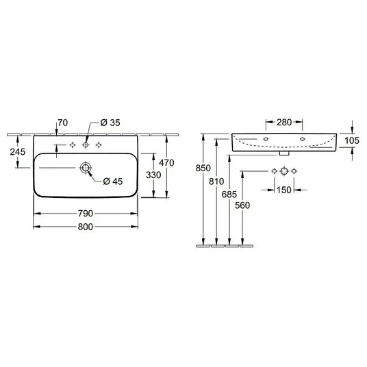 Stačiakampis stalviršio praustuvas su paslėptu perpildymo ventiliu. „Alpine White“ spalvos su „CeramicPlus“ paviršiaus apdaila. Medžiaga: „TitaniumCeram“. Šlifuota apačia, tinka stalviršiams, spintelėms ir montuoti prie sienos. Su paslėptu perpildymo ventiliu. Matmenys: 800 x 470 mm. Perforuota centrinė skylė 3 skylių maišytuvams. Komplekte yra paslėptas „ViFlow“ perpildymo ventilis su keraminiu vožtuvo dangteliu. Maišytuvas į komplektą neįeina ir turi būti užsakomas atskirai. Šis gaminys gali būti pristatytas be originalios pakuotės. Tai skirta apsaugoti gaminį nuo pažeidimų transportavimo metu.