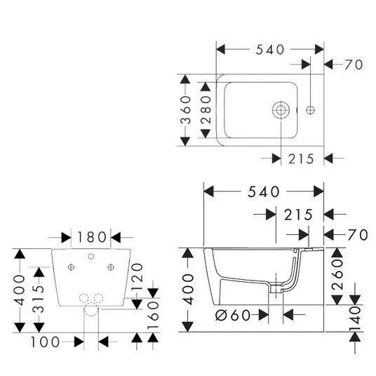 Pakabinama bidė 540 su maišytuvo skylute ir perpildymo anga