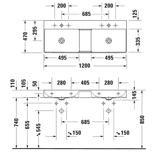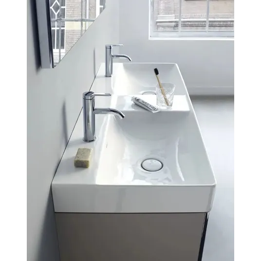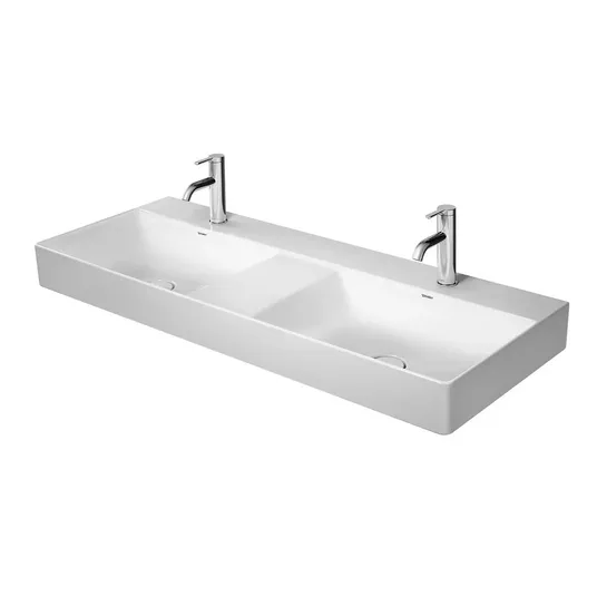 Prie sienos tvirtinamas dvigubas praustuvas be perpildymo vožtuvo. Matmenys: 1200 x 470 x 145 mm. Medžiaga: DuraCeram®. WonderGliss paviršiaus apdaila. Glazūruota apačia. Su 2 skylėmis maišytuvui. Montavimas: prie sienos arba ant spintelės/stalviršio. Neuždaromas sifonas su keraminiu dangteliu yra pakuotėje (2 vnt.). Pavyzdinėje nuotraukoje maišytuvas nepridedamas. Šis gaminys gali būti pristatytas be originalios pakuotės. Tai skirta apsaugoti gaminį nuo pažeidimų transportavimo metu.