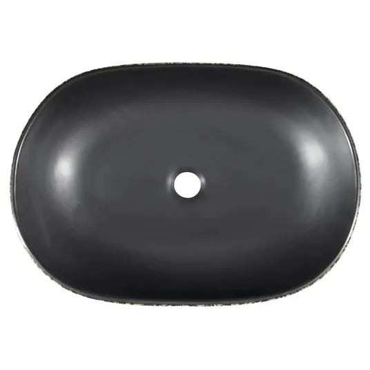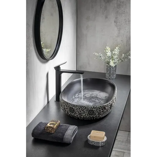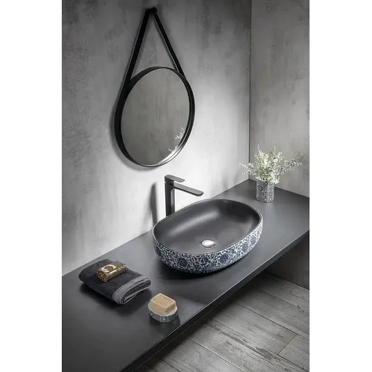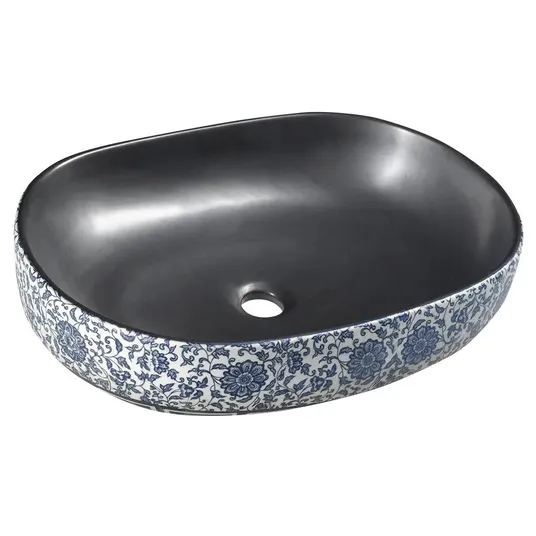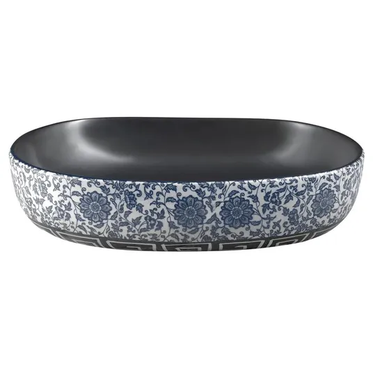 Ovalus keraminis praustuvas be perpildymo angos. Spalva: juoda su gėlių raštu. Medžiaga: natūrali glazūruota keramika. Pagamintas iš natūralios medžiagos; atskirų dalių spalva gali šiek tiek skirtis. Matmenys: 600 x 135 x 400 mm. Montuojamas ant lentos arba baldo. Be skylės maišytuvui. Pagaminta naudojant tradicinius metodus. Kai kurie šios serijos praustuvai pasižymi dekoratyviniu reljefiniu išoriniu paviršiumi, kiti - grafiniu dizainu. Šis gaminys gali būti pristatomas be originalios pakuotės. Tai skirta apsaugoti gaminį nuo pažeidimų transportavimo metu.