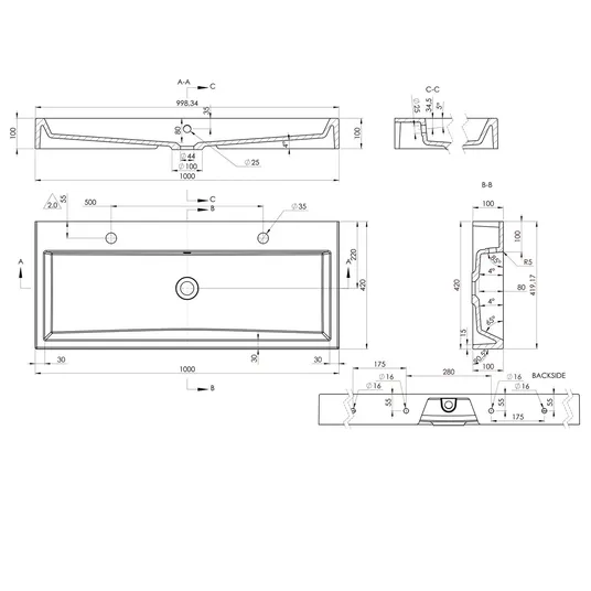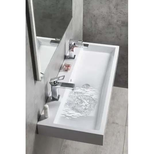 Praustuvo matmenys yra 1000 x 100 x 420 mm, o dvi maišytuvo angos leidžia jį vienu metu naudoti dviem žmonėms. Taip pat yra perpildymo jungtis.